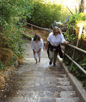 On the Bernard Steps in Mill Valley one evening, I meet a delightful couple en route to a film festival screening from their home up the hill. He looks familiar, but I can’t place the face. They say they’re step-climbing regulars. “I love it when we can do errands on foot,” says the woman, talking as we walk down Bernard Street. “I feel European.”