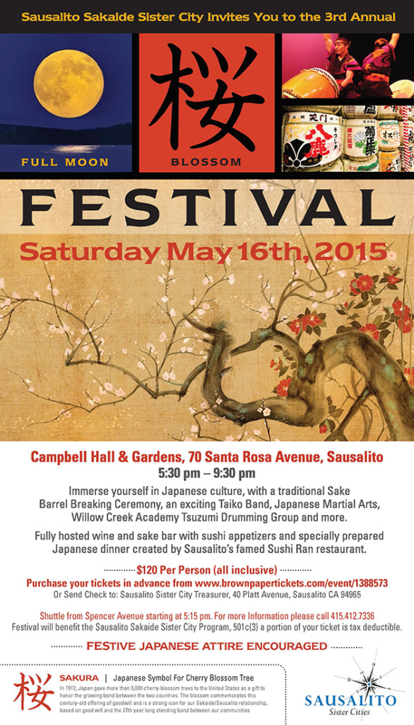 A benefit for Sausalito’s sister city student exchange program with Sakaide, Japan, the event is an opportunity to immerse oneself in Japanese culture with a traditional sake barrel breaking ceremony, martial arts, Taiko and Tsuzumi drumming, not to mention sushi appetizers and an exquisite Japanese buffet dinner hosted by the legendary Sushi Ran in Sausalito. The party is from 5:30- 9:30 p.m. at Campbell Hall and Gardens, 70 Santa Rosa Avenue, Sausalito (across from the Episcopal church). Cost is $125 per person (all inclusive – sake, wine bar, reception, dinner and entertainment). Festive Japanese attire is suggested, so pull out that kimono you never wear.