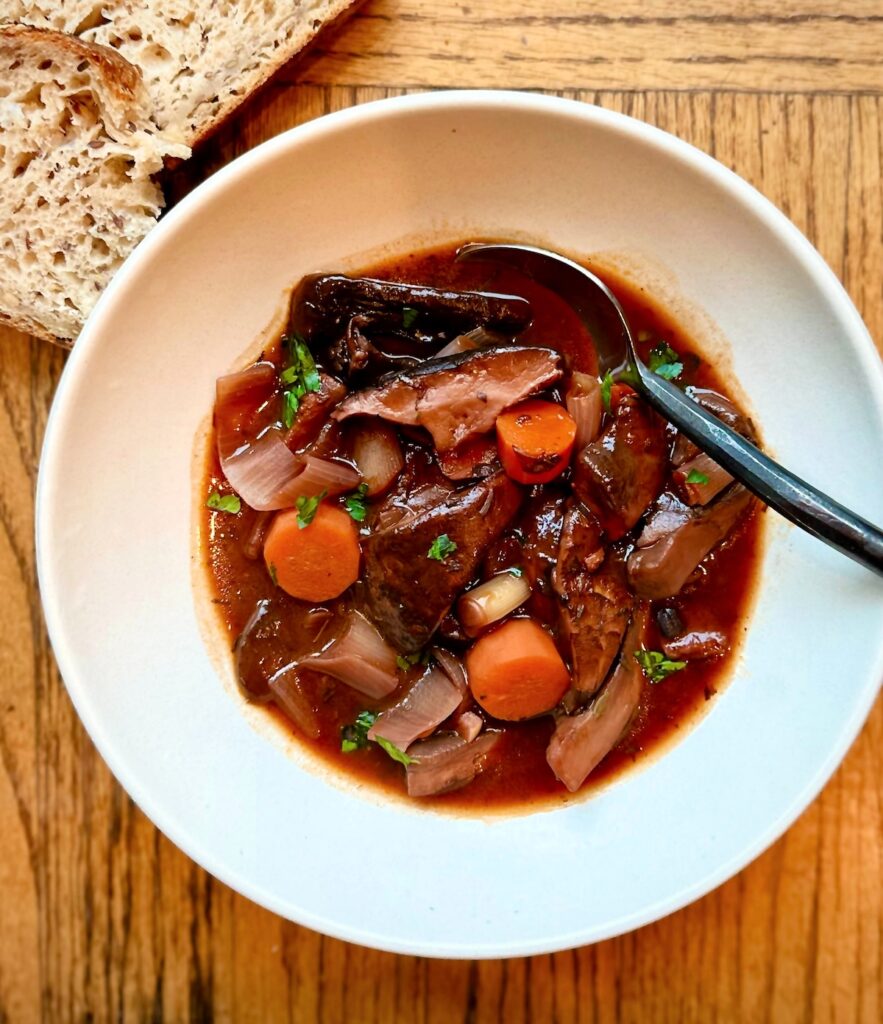 Chances are that this vegetarian stew will satisfy any meaty craving. The method for this vegetarian recipe is based on beef bourguignon, a French classic that includes beef and red wine — minus the beef. Mushrooms handily step in as the main ingredient. Not only are they known for their meaty consistency and heft, but they also contain glutamate, an amino acid which provides savory, rich umami qualities to food. True, mushrooms do not provide the same amount of protein as meat, but they do have a higher protein content than most vegetables, and they carry a treasure trove of nutrients. Mushrooms are a rich source of fiber, vitamins and antioxidants, and they are fat and carbohydrate free.