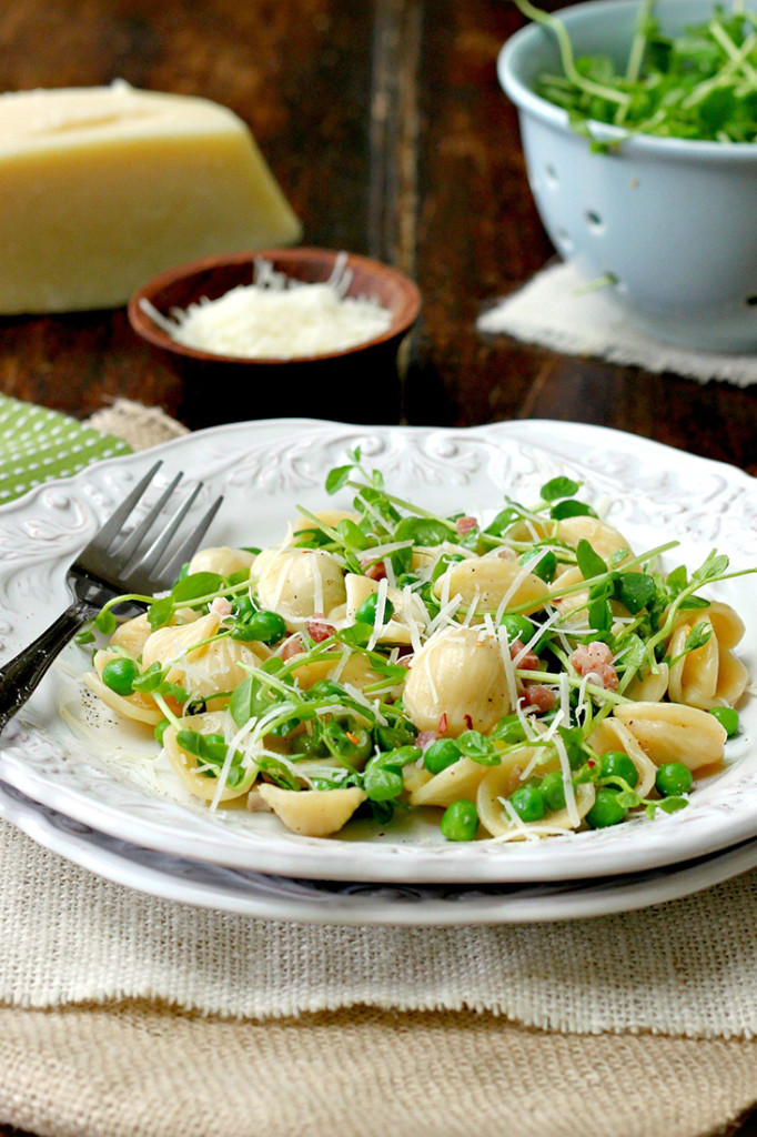 Orecchiette with Spring Peas, Pancetta and Pea Shoots