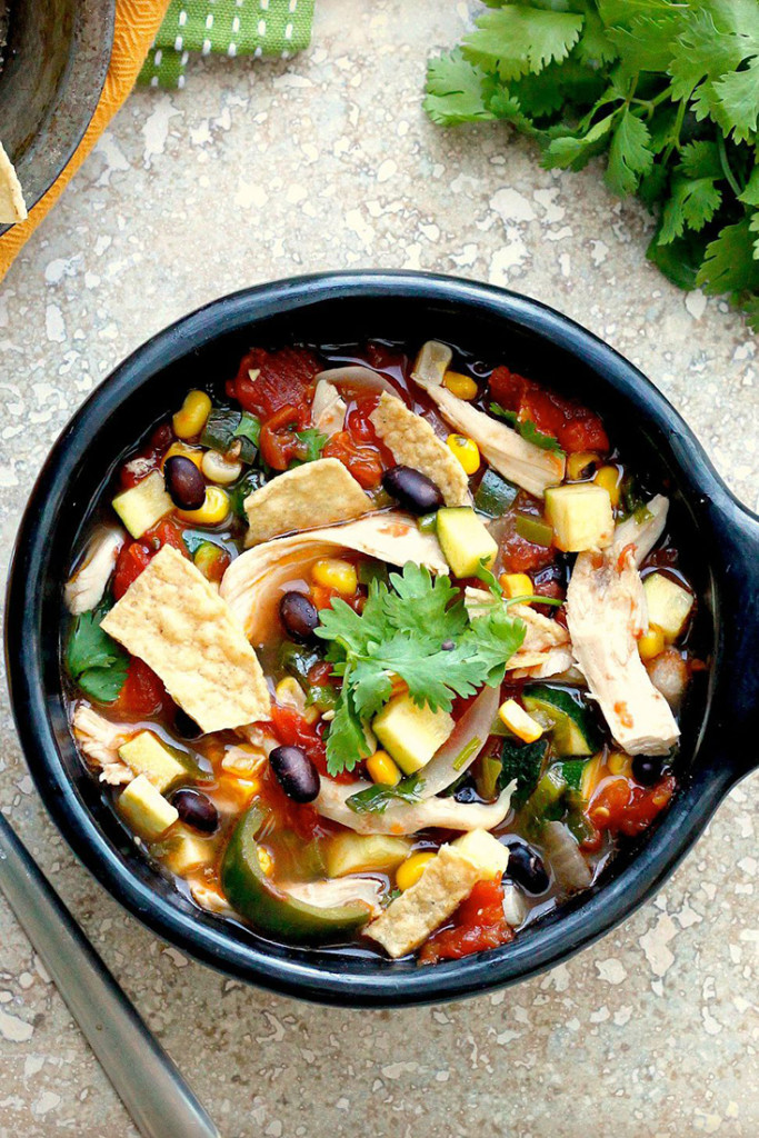 - Stir in the chicken, corn, and beans. Partially cover and simmer over medium-low heat until thoroughly heated through, about 10 minutes. Stir in the cilantro and taste for seasoning. Ladle into bowls and serve garnished with tortilla chips.