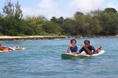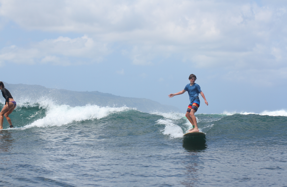 Hence justifying paying for surf lesson through his school, when my husband, Pete and his buddy could teach the kids was easy, Pete doesn’t know the water and we’d have to rent boards anyway. The other family agreed. Signing up on the website was easy, and a quick call- his wife, Hiriata answers the phone- to confirm timing and various details including we would forgo Buttons as the teacher and opt for a less expensive pair of instructors and there would be board rentals available for the two dads.