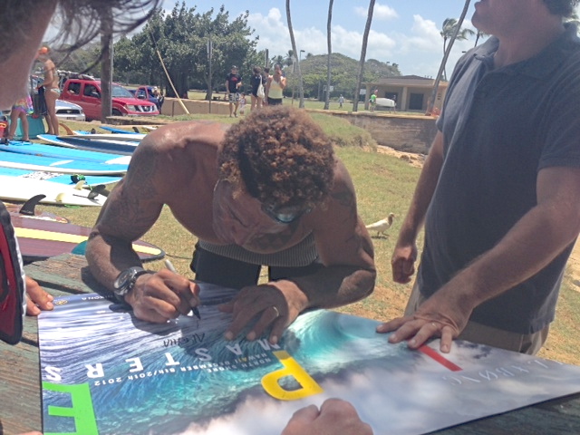 Returning to the BSS compound, there was another group lesson getting fitted for boards, sun shirts, Hiriata busily getting signatures, his daughter Nawaiomalukea aka Navi, fast asleep in the shade, Nuutea, his son jumping on his dad begging for another ride in the surf. He graciously talked with our group about people known in common and the best surf spots for learning. Two men approach our picnic table with noticeable respect, “Uncle, can you sign this for our bruddah Timo.” Button unravels a large Pipeline Masters poster, and gets down to business.